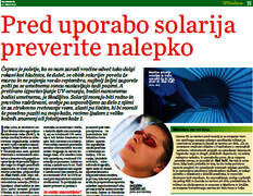 Pred uporabo solarija preverite nalepkoV dnevniku Slovenske novice je bil 14. 3. 2014 objavljen prispevek o zahtevah, ki jih moraj ozpolnjevati solariji v Sloveniji ter o napotkih uporabnikom solarija, kako čimbolj zmanjšati tveganja zaradi izpostavljenosti UV sevanju solarijev. Članek si lahko preberete tukaj Zadnja novica